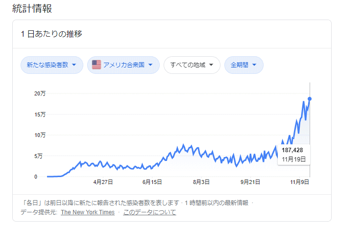 YTNによるとアメリカではここ1週間、1日当たりの新規感染者が16万人に達しており、1分あたり1人の割当で死者がでていると報じています。状況については1週間後に迫った感謝祭が最大の峠になると考えられているものの、アメリカでは強い拡大抑止政策がとられているものの目立った成果は現れていないとしています。