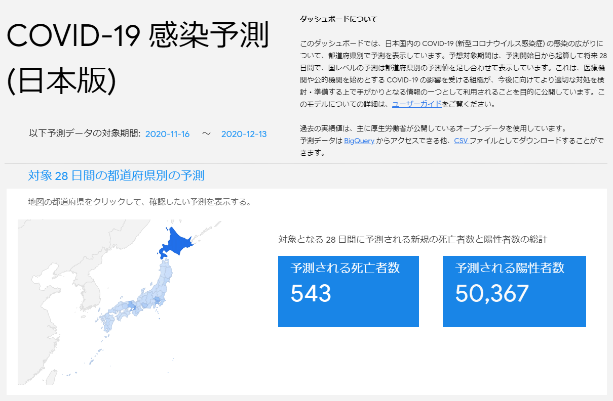 検索大手グーグルが日本向けに公開したのは『COVID-19 Public Forecasts』という、人工知能AIと医療機関や公的機関が公開しているデータと組み合わせることで将来の新型コロナウイルスの予測を扱うというものです。