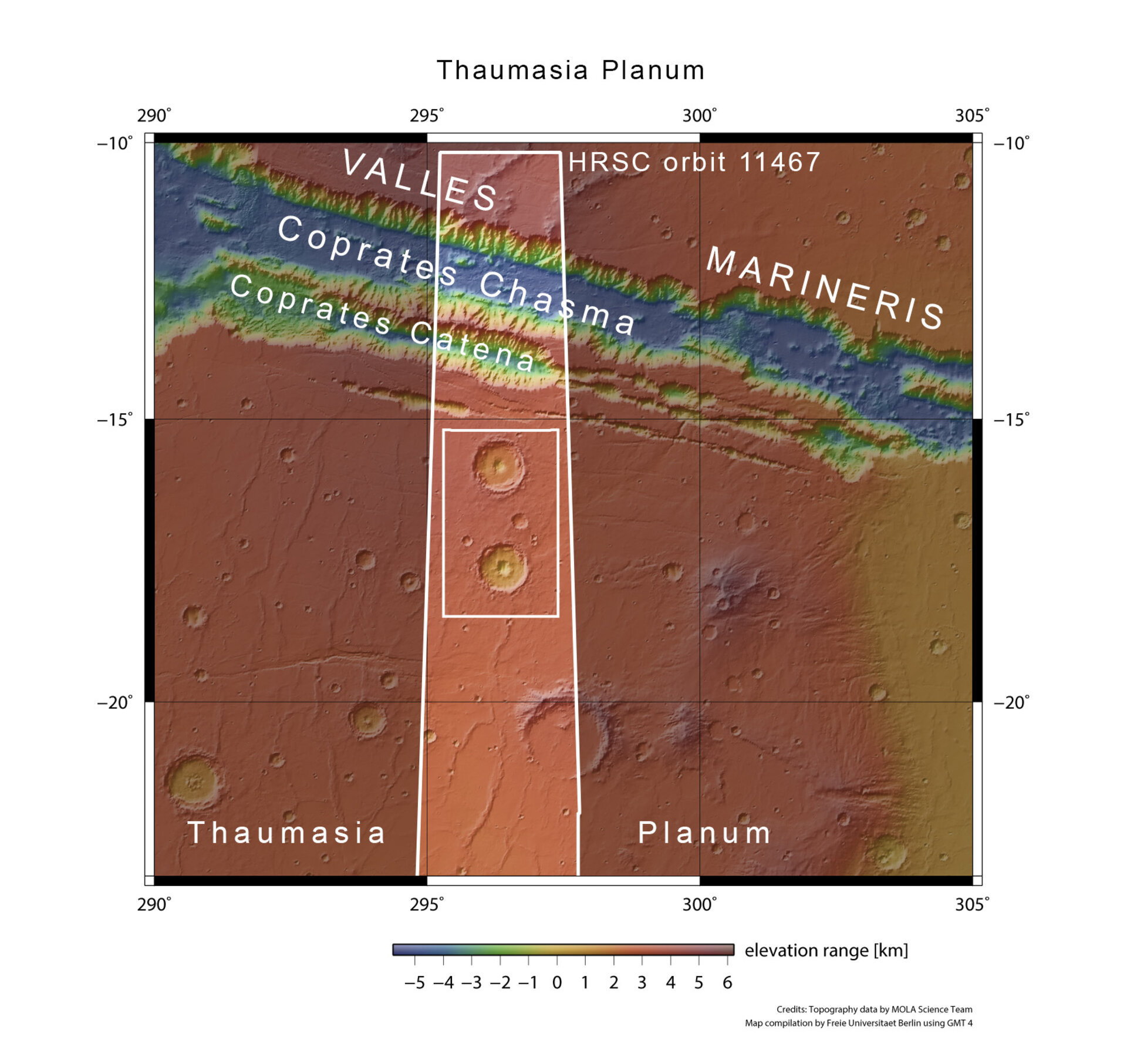 2005年マーズエクスプレスにより撮影されたクレーター『オルクス・パテラ』。クレーターといえば円形をしているもののこのクレーターは長さ380km幅140kmという楕円形をしている特徴があります。どのように形成されたのかは明らかになっていないものの、極めて浅い角度で隕石が衝突した説、火山や地殻変動で変形した説などがあるもののはっきりしたことは分かっていません。