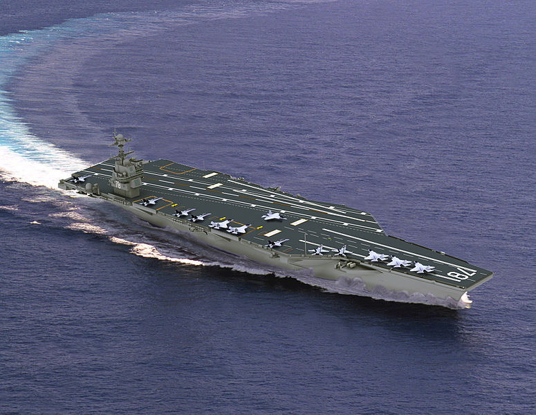 ジェラルド・R・フォード級航空母艦は2015年竣工を予定している米海軍最新の原子力空母。全長は333m、排水量は10.1万トン(満載時)。ステルス性配慮の船体や電磁式カタパルトをはじめ、50年間燃料交換不要の原子炉2基を搭載しています。搭載機は艦載型航空機や無人攻撃機、ヘリコプターなどをあわせ75機となっています。(Wikipedia)