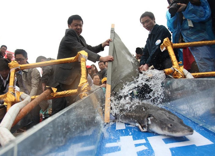 ▲人工孵化で育てたカラチョウザメを放流(2012年4月:長江)