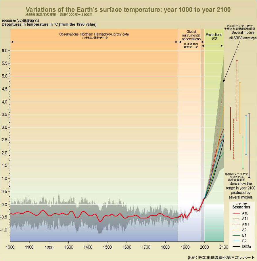▽地球の気温変化 1000年~2100年(1990年基準)