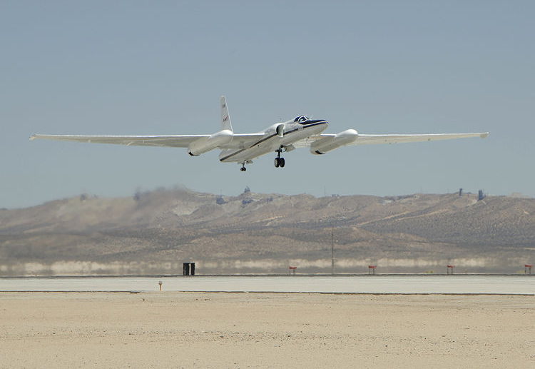 こちらはNASAが運用している研究用のU-2(ER-2)。離陸後間もない写真なのですが、両翼の補助輪は切り離され胴体のみの車輪だけとなっています。