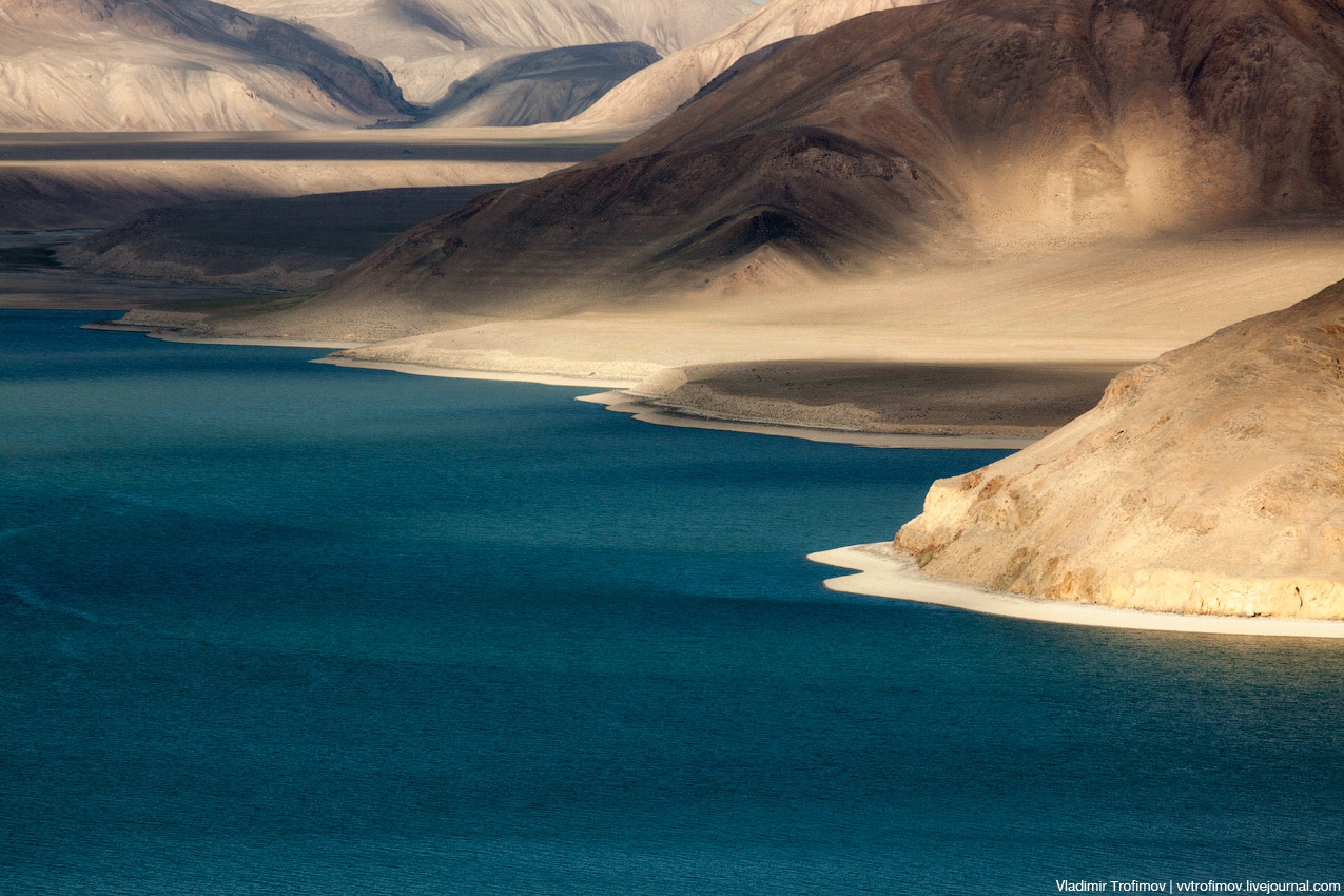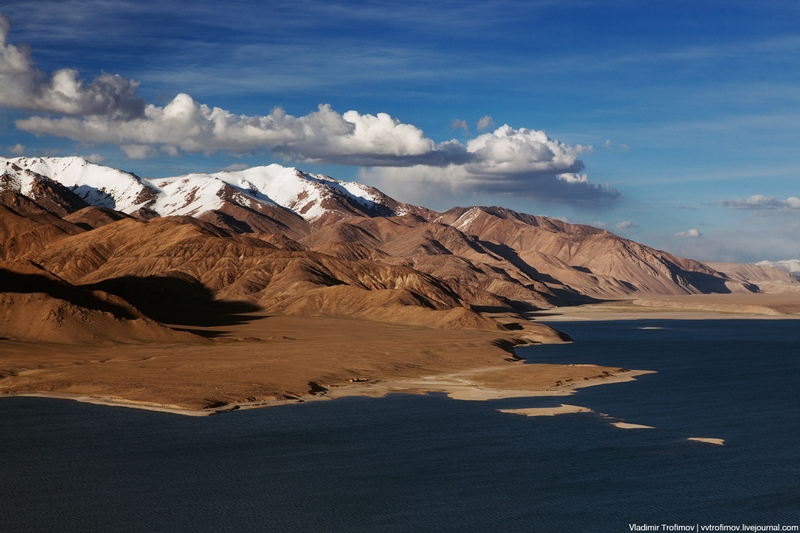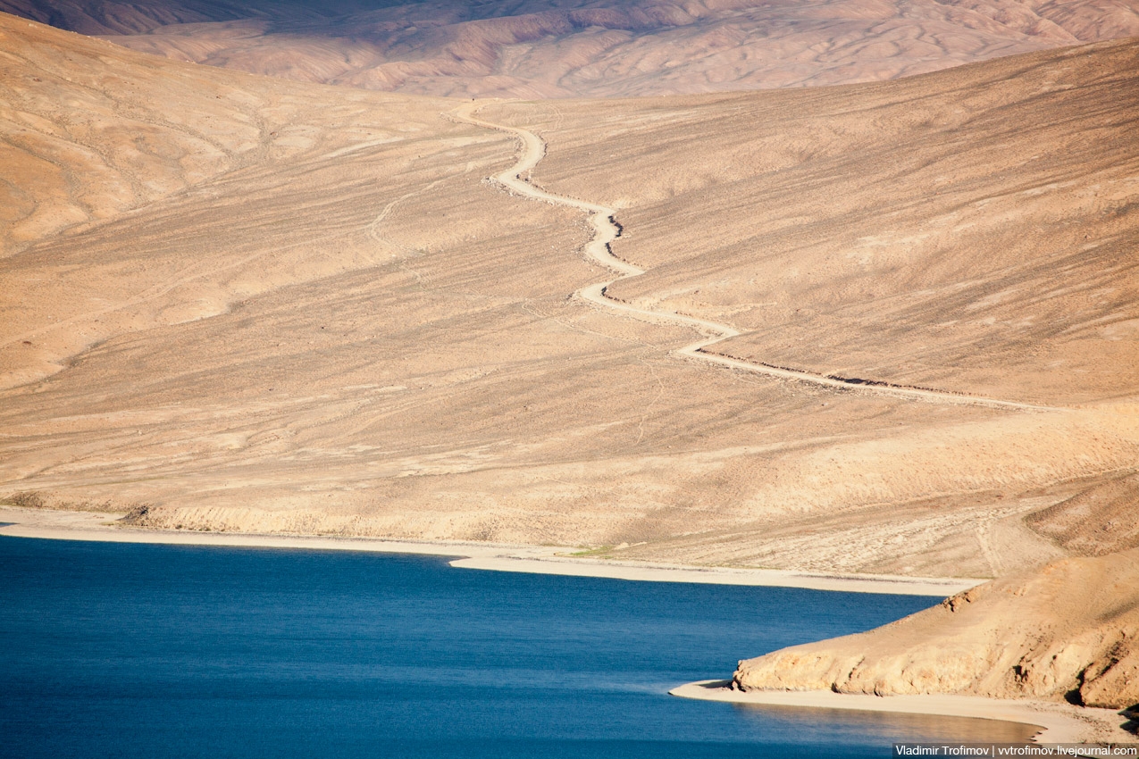 木が生えていない山肌と真っ青の湖が美しいこの風景が見れるのは、パミール高原です。