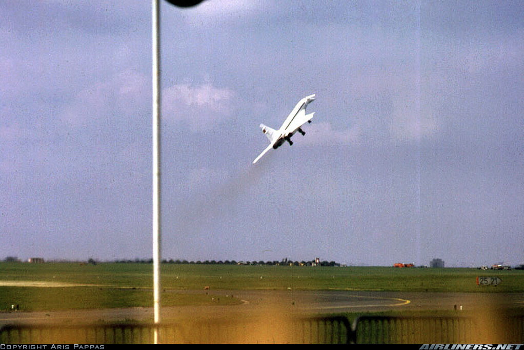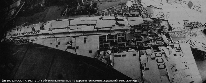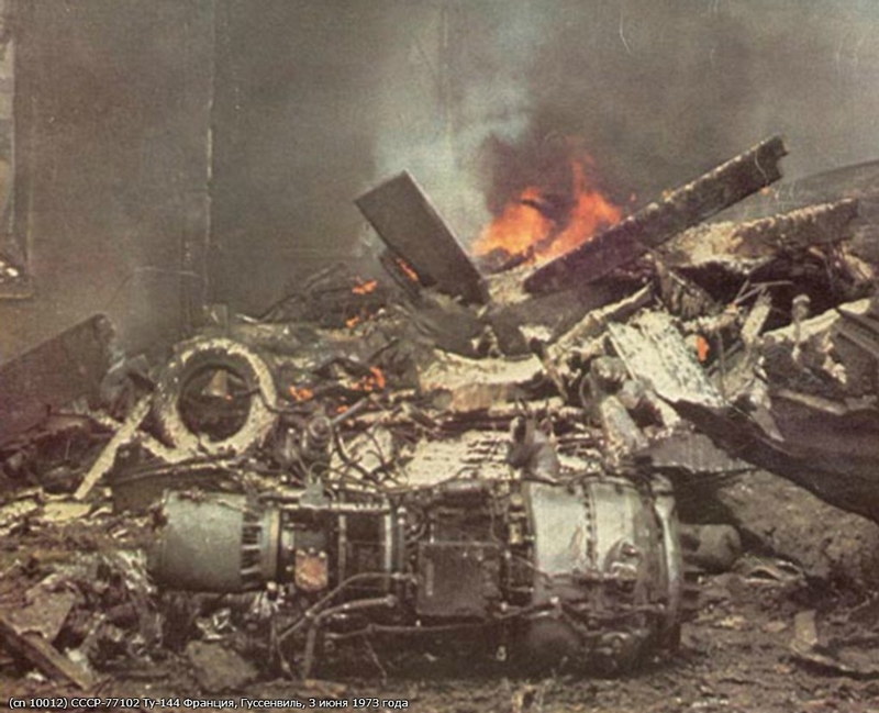 1972年3月20日、Tu-144の量産型2号機として初飛行したCCCP-77102(Tu-144S)は、翌年1973年6月3日パリ航空ショーで展示飛行中に墜落しました。原因は30万人前後がいたという会場正面を低空で通過するパフォーマンスを行った後、急上昇するという飛行が行なわれました。しかし、失速してしまい機体を水平に戻そうと機首を起こす動作を取ったところ機体性能を超える荷重が加わり左の翼が折れ墜落しました。