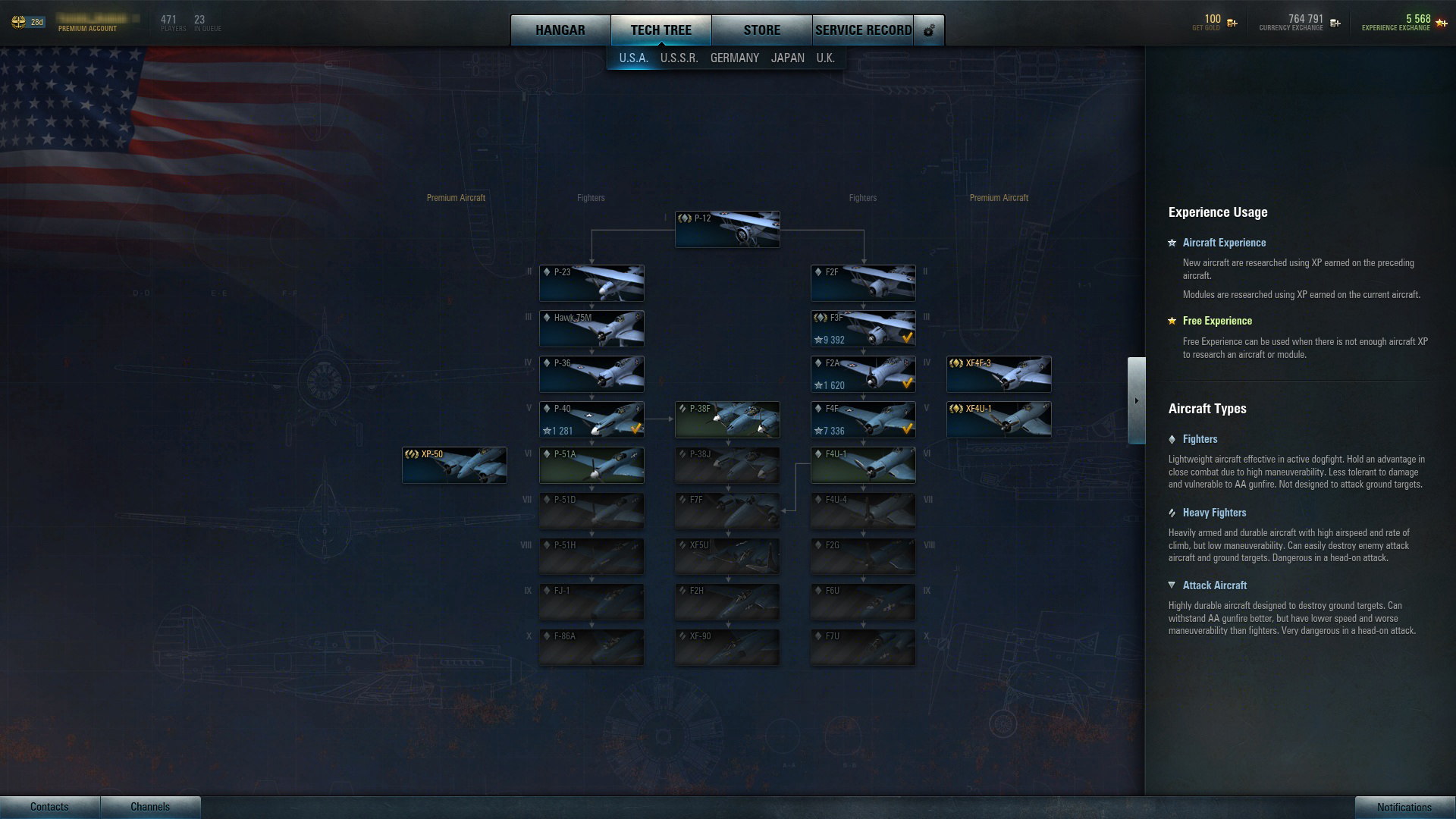 現在、アメリカ(U.S.A.)、ソ連(U.S.S.R)、ドイツ(GERUMANY)、日本(JAPAN)、イギリス(U.K.)の軍用機が実装されています。最初にゲームを始めると5カ国のTier1の機体がハンガーにあり、その機体で戦闘を行うことで経験値とクレジットを獲得することができます。経験値で戦闘機のエンジンや機銃を研究することで、Tier2、Tier3と上級の機種に進んでいくことができます。基本的なことはWorld of Tanksと同じ仕様です。