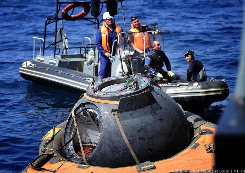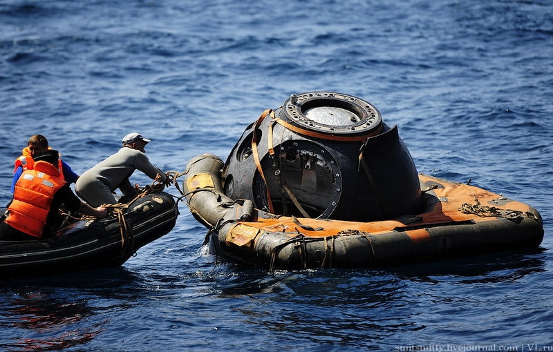しかし、何らの不具合により着陸地点がずれ海上へ着水する恐れもあることから、ロシアでは年に数回、海上での回収を行う訓練が行なわれているそうです。