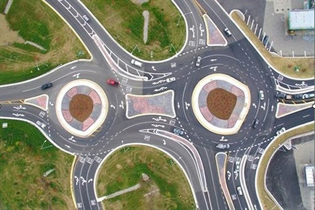 2つのラウンドアバウトが隣り合うという通称「ダブルラウンドアバウト」。