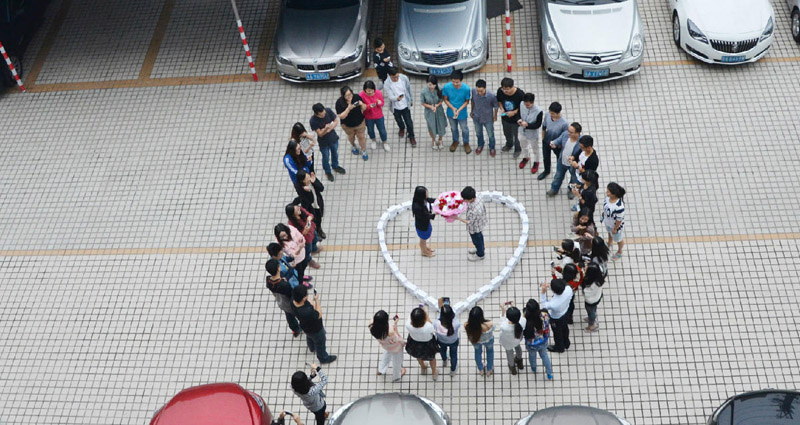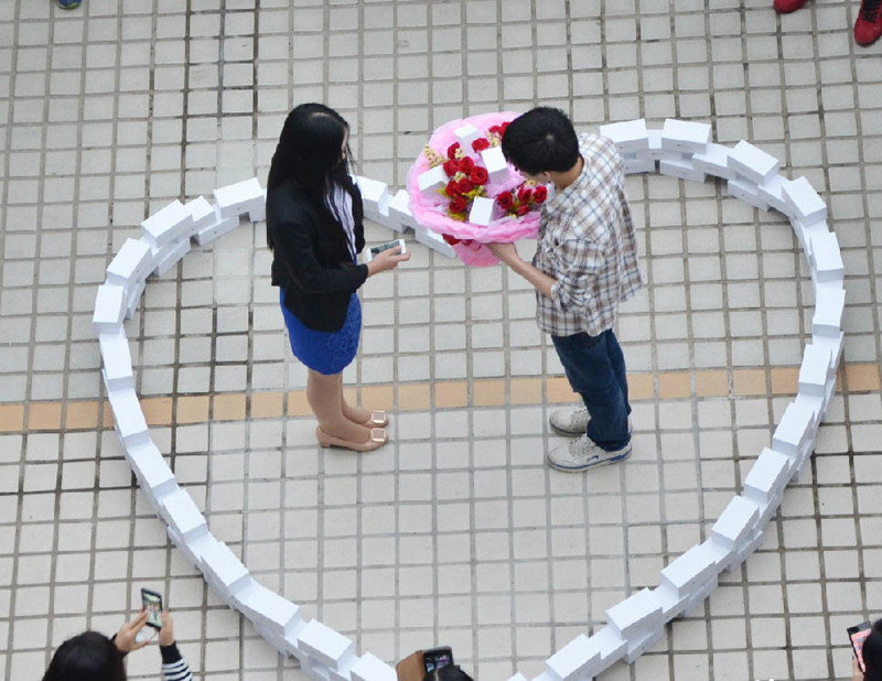 中国広東省広州市のとある企業に務める男性は同僚の女性に告白しました。彼が手に持って持っているのは花束と謎の箱、そして同じような謎の箱でハートマークを作っています。実はこの箱、全てiPhone6だというのです。