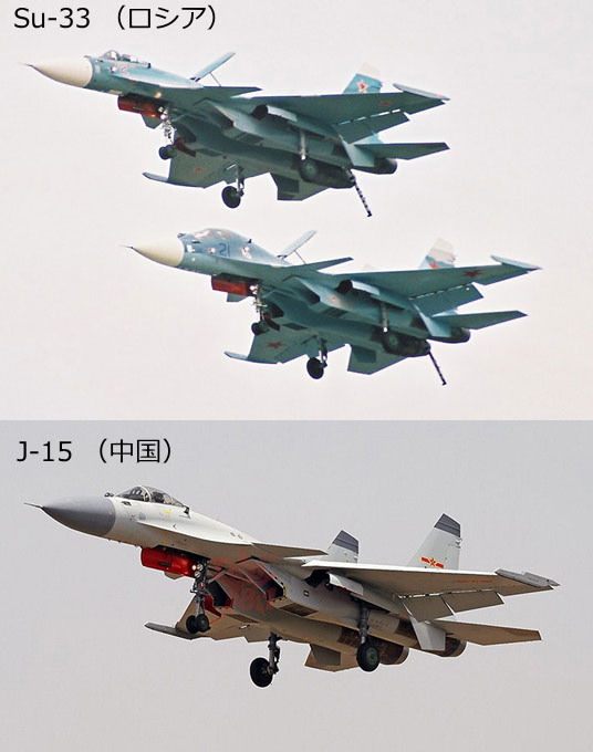 また、中国の艦上戦闘機「殲15」はロシアで開発された艦上戦闘機Su-33を不正にコピーし設計したもので、日本周辺国の軍事兵器というサイトによるとコピー元のSu-33を艦上戦闘機として使用した場合、『空母からの発艦の場合、最大離陸重量が26,000kgに制限されるため、空対空ミサイル8発(合計重量2t)搭載の場合は搭載燃料を60%に制限する必要がある。この場合、母艦から800km先に進出して哨戒を行える時間は30分に制限される事になる』と紹介しています。