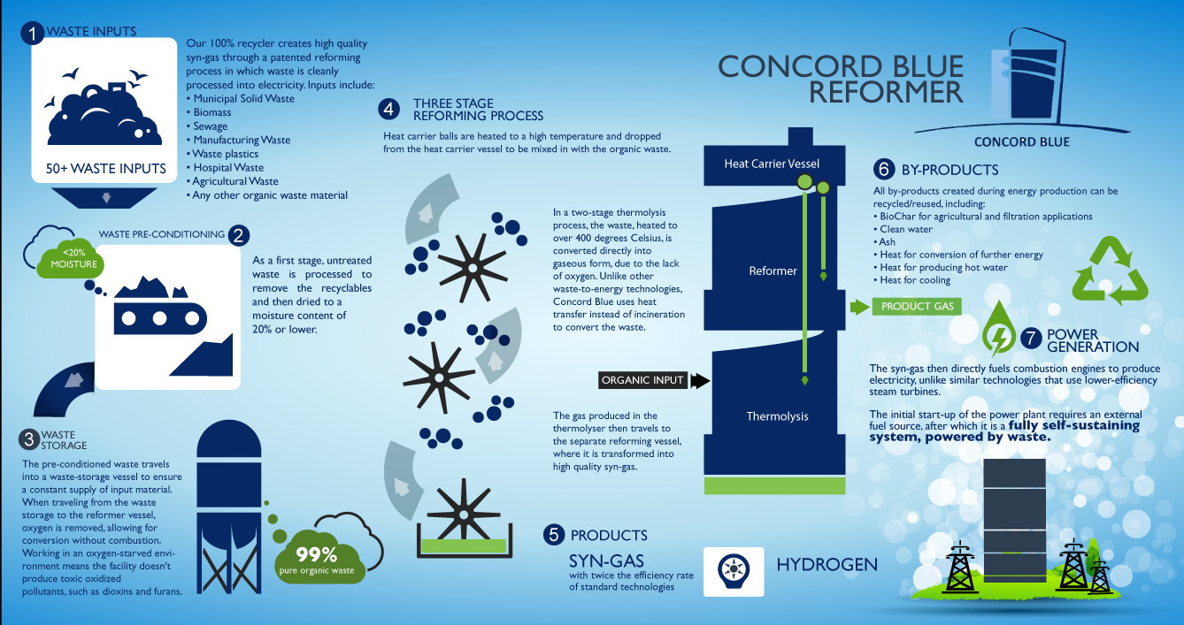 ロッキード・マーチンによると今回建設するのはConcord Blueが誇るReformerテクノロジーが使われた発電所です。Reformerテクノロジーとは間伐材を含む複数の有機物を蒸気熱分解しガス化しエネルギーに変換するというもので、ロッキード・マーチンが発電所の設計から建設を行いConcord Blueがテクノロジーの技術提供を行うとしています。