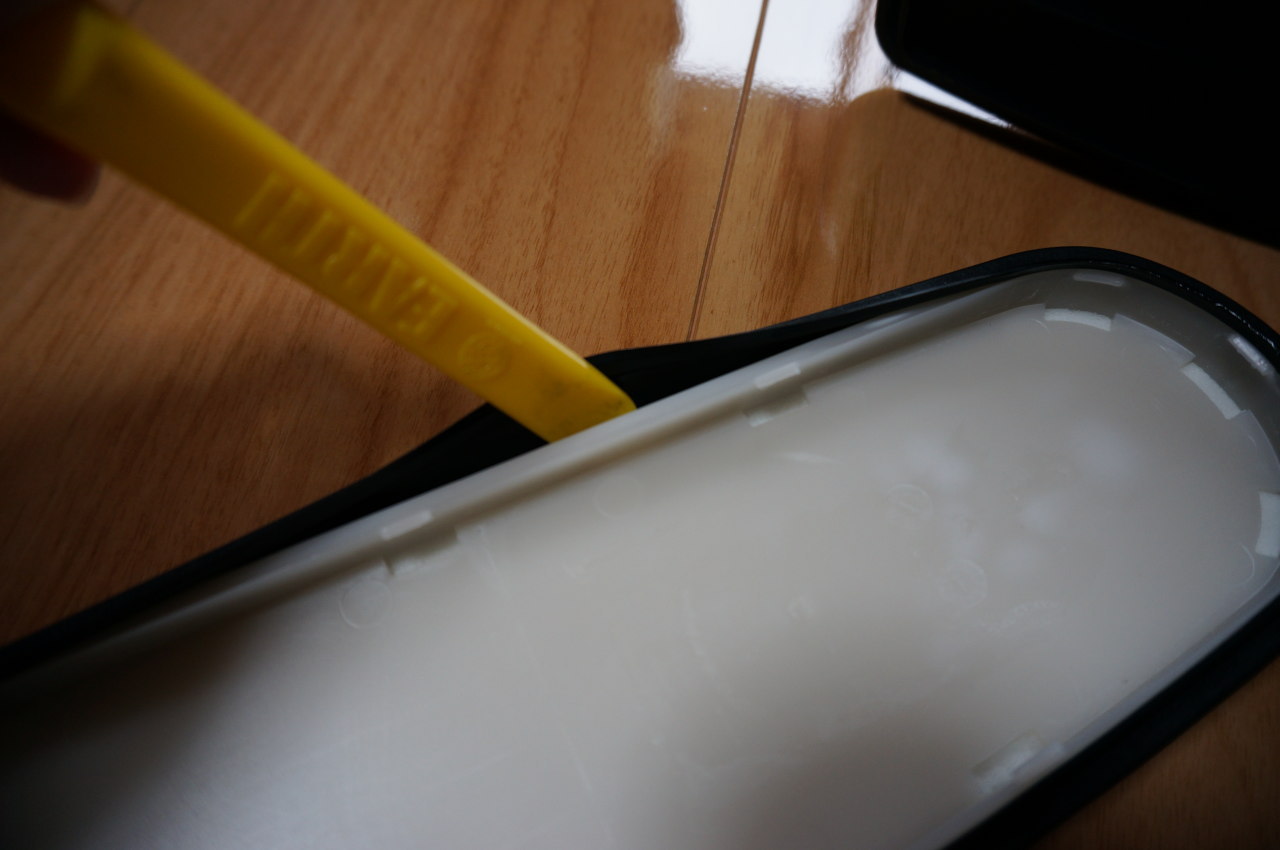 ▼側面の繋ぎ目にマイナスドライバーを差し込む。前側は開けにくいので後ろ側から開けていく。