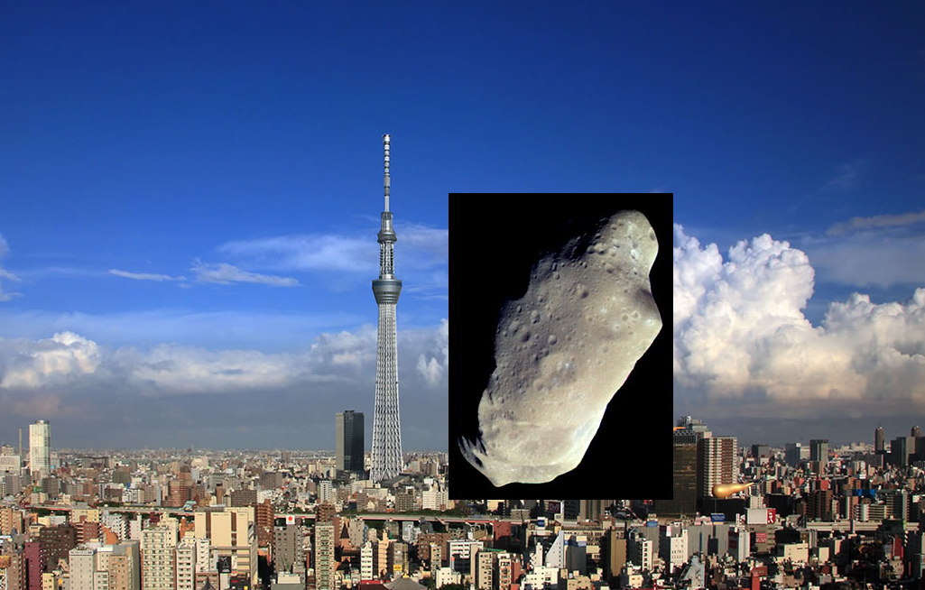 2011 UW-158はどのくらいの大きさなのかという点について東京スカイツリーと簡単に比較した画像を用意しました。サイズ等は全て目安です。(小惑星は1998 qe2)