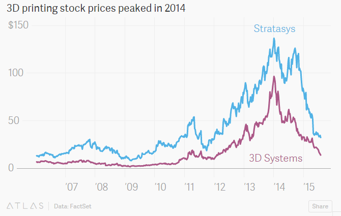 こちらの表は3Dプリンタメーカー大手『Stratasys』と『3D Systems』の株価を年ごとに表したものです。両企業とも14年にピークを迎えた株価が現在は1/4に以下になっており、3Dプリンタという言葉が世間に出始めた頃に戻った形になっていると報じられています。