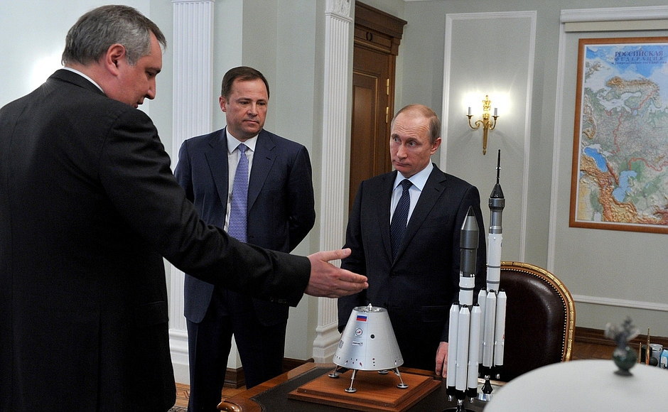 ▼ロシア宇宙庁長官とプーチン大統領、模型はPTK NP、アンガラA5、アンガラA5V(2015年)