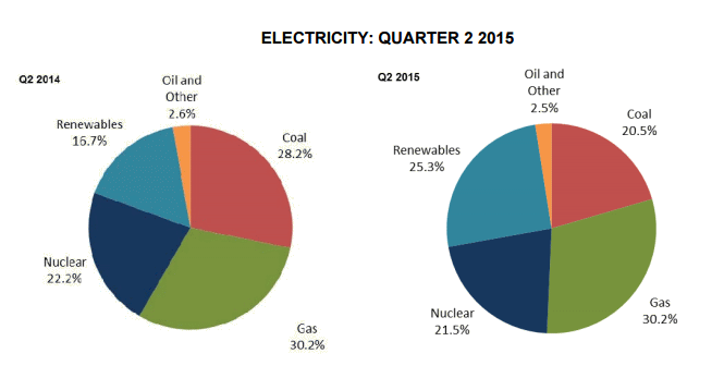左は2014年第2四半期、右が2015年第2四半期のもので赤が石炭火力、緑が天然ガス(火力)、青が原子力、水色が再生可能エネルギー、オレンジが石油(火力)とその他となっています。イギリス政府によるとこの赤の部分について二酸化炭素排出量の問題から2026年までに取り除くとしています。