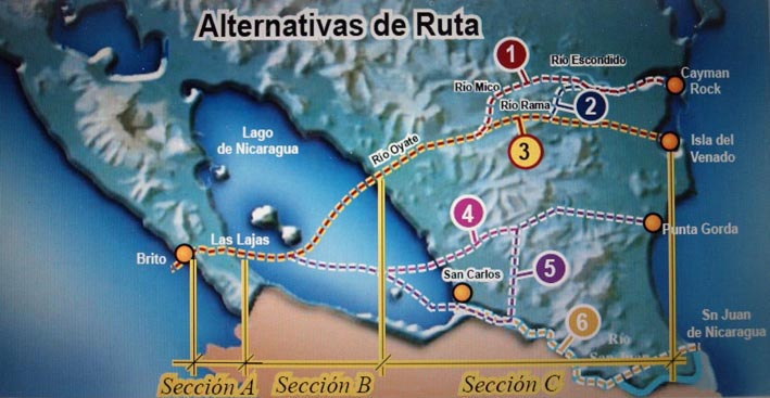 ▼ニカラグア運河については6つルートがあり、2014年7月7日明らかになったのはブリト川、ニカラグア湖、プンタ・ゴルダ川のルートです。(下の画像では④のルート)