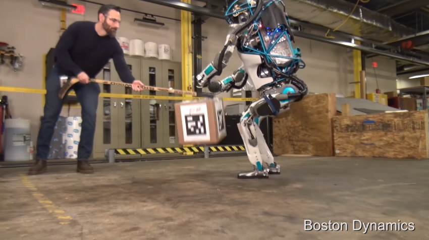 そしてボストン・ダイナミクスではお馴染みのロボットにいじわるをするシーンです。今回は“蹴り”を入れるのではなく後ろから突くという方法が行われました。床には厚めのマットが敷かれているのですが顔面からの転倒でも故障することはなく素早く立ち上がり歩行を開始しています。