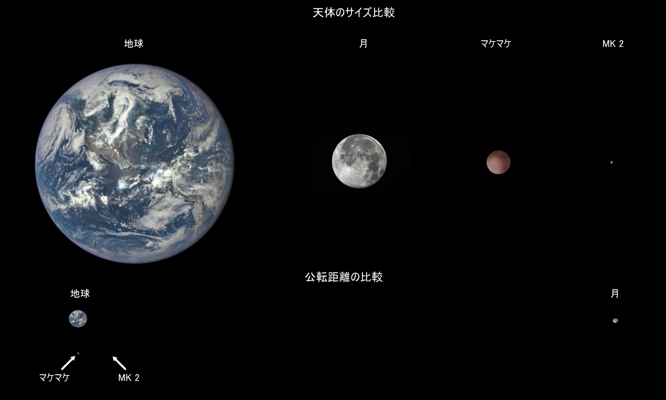 わかりやすく表現するため地球と月、マケマケ、MK 2を比較したものを用意しました。(マケマケやMK 2は想像図でありそれぞれのサイズ等は目安です)