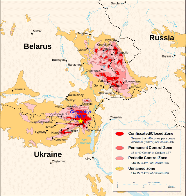 ▼チェルノブイリ原発事故による放射性セシウム汚染。ベラルーシ共和国、ウクライナ、ロシアに広く拡散している