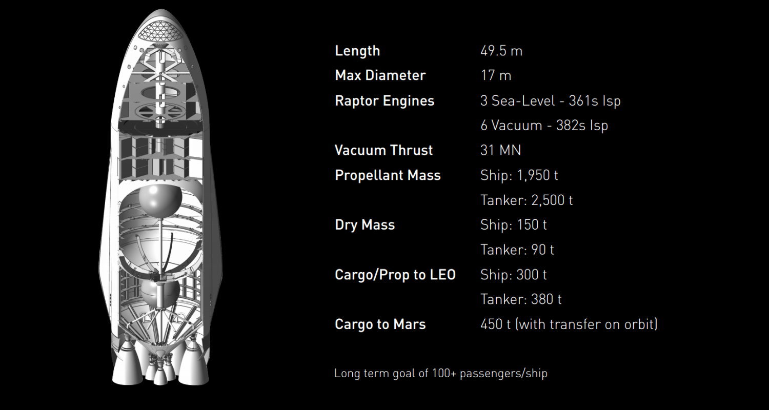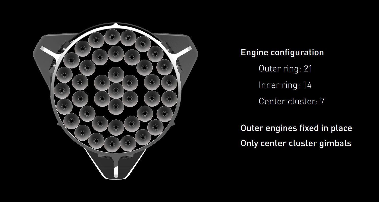 インタープラネタリー・トランスポート・システムで運用されるロケットは2段で構成されており、第1弾は合計42機のラプターエンジンを燃焼させ上段を宇宙空間に送り込みます。この上段はスペースシャトルのように宇宙船本体にロケットエンジンが搭載されており6つの大型エンジンと3つのエンジンの計9基で構成されています。