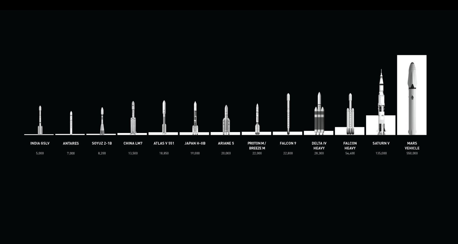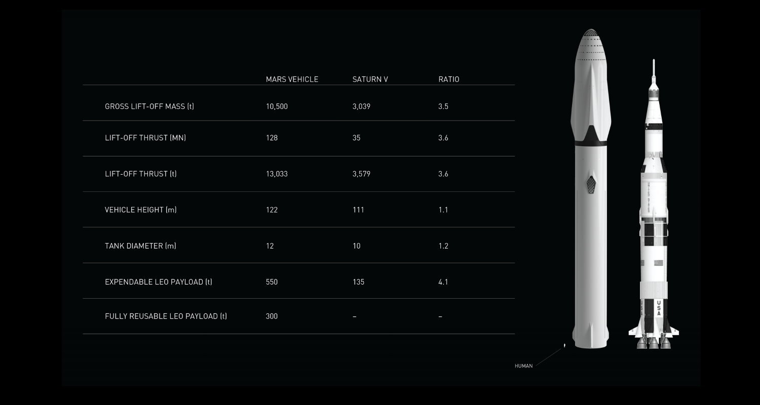 ロケットの性能を比較する場合、国際宇宙ステーションが周回しているような低軌道(LEO、地上約500km)へどのくらいの質量を送り込むことができるのかという数値があります。この場合、日本が国際宇宙ステーションへ物資輸送に使用しているH-IIBの場合は19トン、ファルコン9が22.8トン、現在運用されている中で最大のデルタⅣヘビーが28.3トンです。また過去最大級の打ち上げ能力を有していたサターンVが135トンとなっているのですが、インタープラネタリー・トランスポート・システムのロケットに関してはサターンVの4.1倍、約550トンとなっています。(ただし再利用の打ち上げでは帰還時に使用する燃料の関係から300トンとされている)