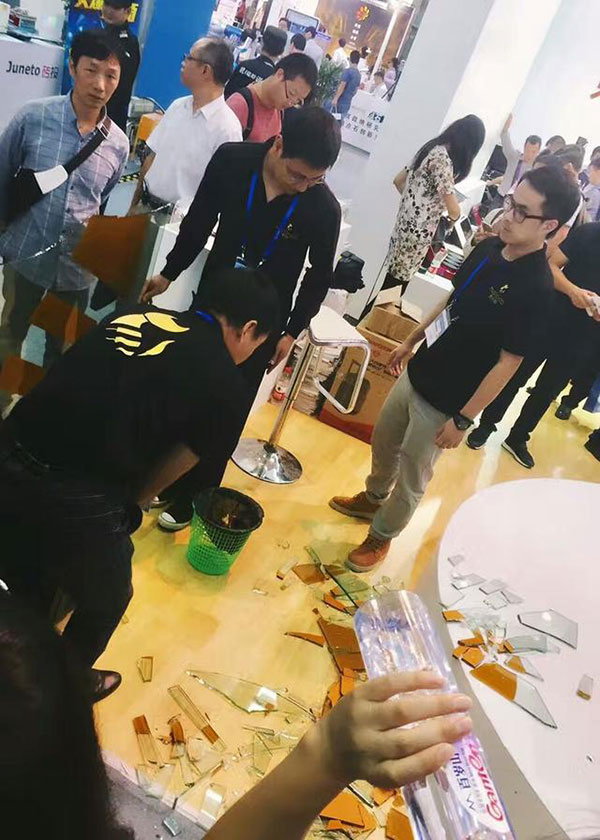 ちなみに、ロボットは『家事手伝い用のヒト型ロボット』で近くの企業のブースにあった1cmほどの厚いガラスを破り止まったとしています。