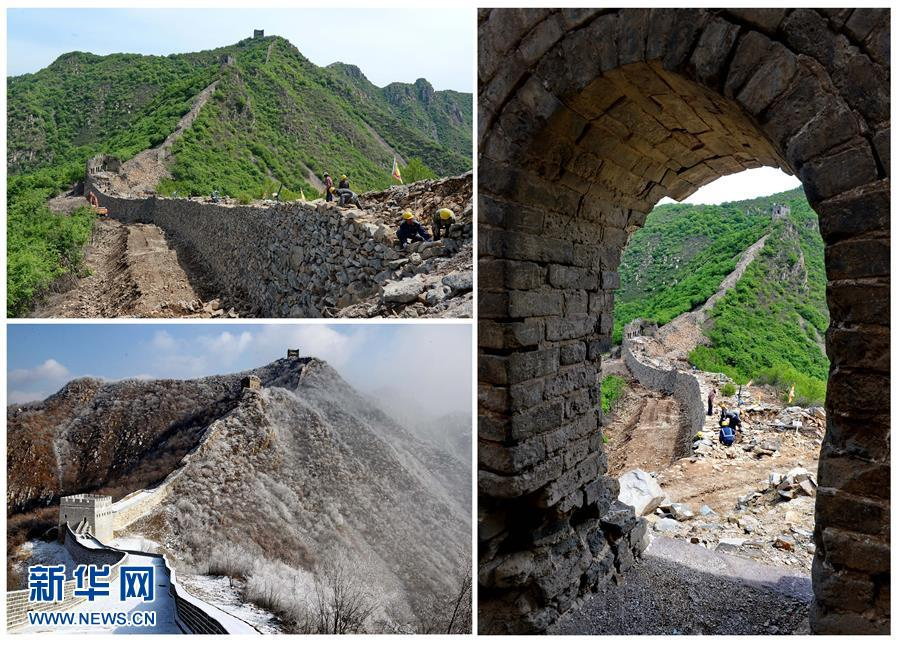 ▼秦皇島市板場峪長城。左上は修復中、左下が修復後の様子