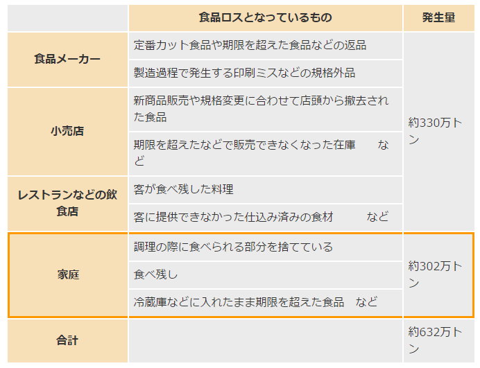 現在日本における食品ロスのおよそ半分、年間300万トンあまりが家庭から発生していると言われており食品ロスを少なくするにはレストランや食品メーカー、小売店だけではなく消費者である私達の意識を変えることが重要になると考えられます。