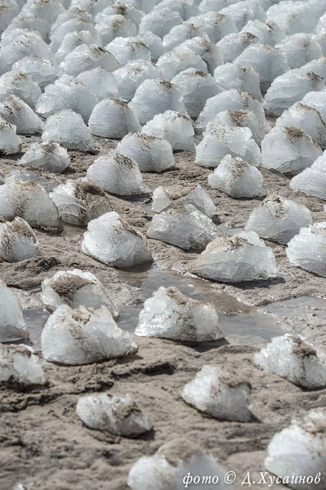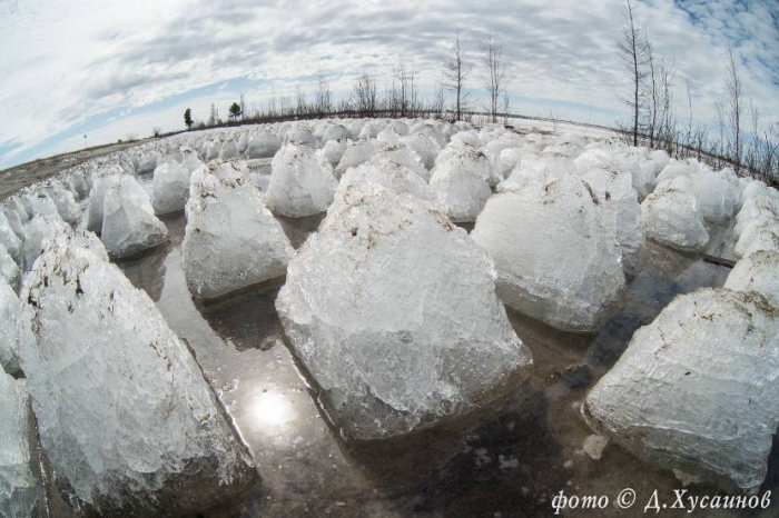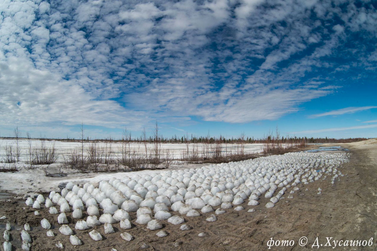 詳細は不明なのですが、この写真が撮影されたのはロシア、ヤマロ ネネツ自治管区『ノーヴィ・ウレンゴイ』という街の郊外です。そこには湖があるらしくようやく氷が溶け始めたものの溶け方が異常で同じサイズのピラミッド型になり溶け始めていたというものです。動画はこちらから