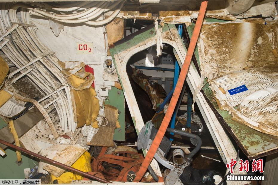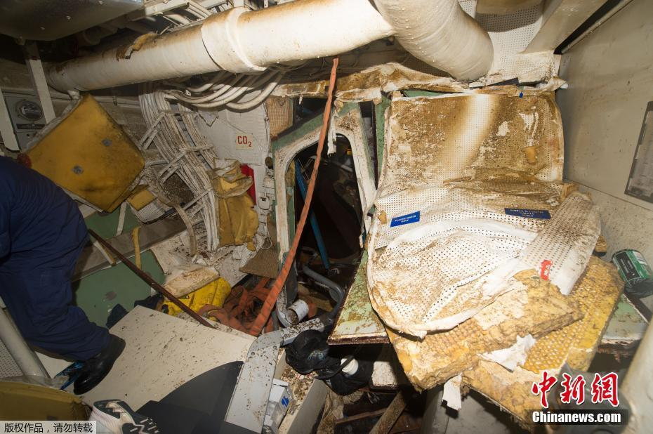 この写真は米海軍が今月17日に公表した事故発生直後艦内の様子をまとめた報告書に添えられた写真です。事故は2017年6月17日深夜1時、フィリピン船籍のコンテナ船「ACXクリスタル」の船首とイージス艦「フィッツジェラルド」右舷側が衝突したもので、報告書によると艦長室を含む乗員の寝台区画が損傷したとしています。