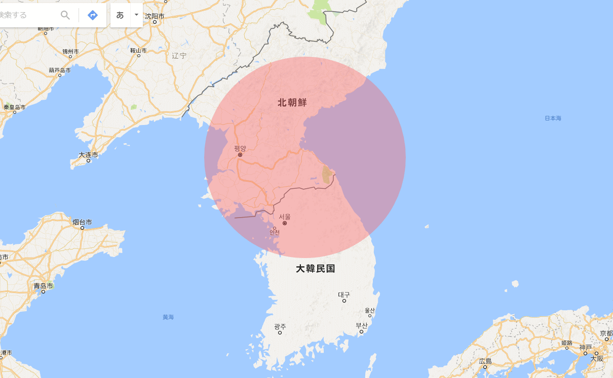 発射地点を中心に250kmの円(目安)