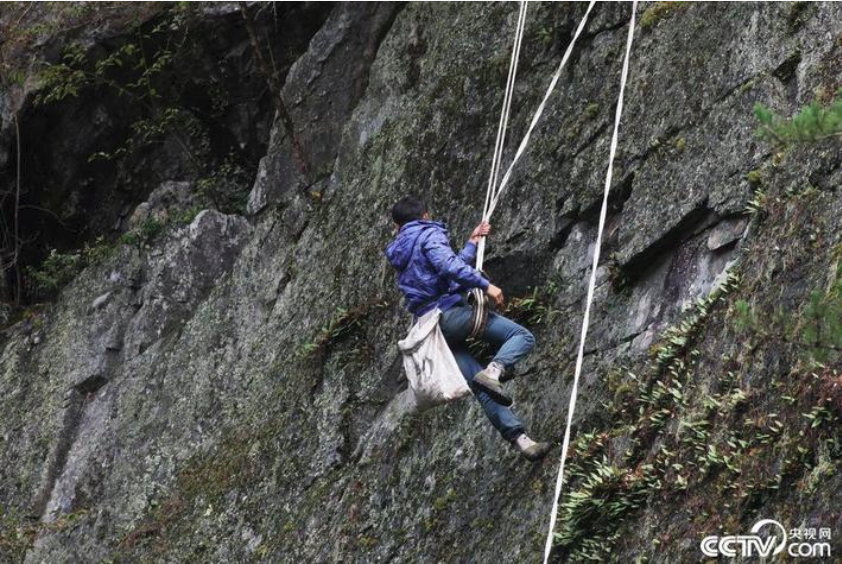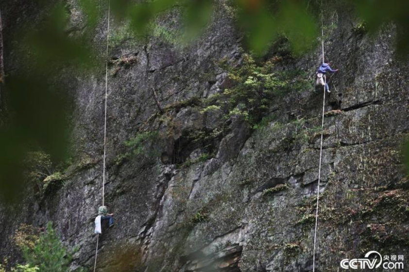 ロープを手がかりに断崖絶壁で岩茸(イワタケ)取りを行う姿。中国では『石耳』などと呼ばれ山菜として食べられる以外も生薬としても利用されることもあります。