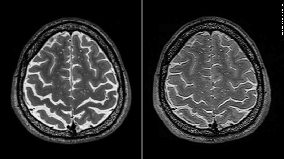▼長期滞在した宇宙飛行士の脳(左)、右は滞在前に撮影したもの
