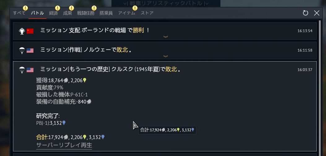 プレミアムアカウントで小基地を1つ破壊+地上のターゲットを数箇所破壊し、敗北したときででこのくらいです。(勝利した場合はリサーチポイントやシルバーラインオンは1.2倍の数値になります)。実際のところそこまで多くは稼げないもののクルスクの場合はゲーム開始から落とされるまで7分前後になるのでアーケードバトルと比べてどのくらいになるのか、1バトルあたりの時間などご自身の戦果を比較してみてください。