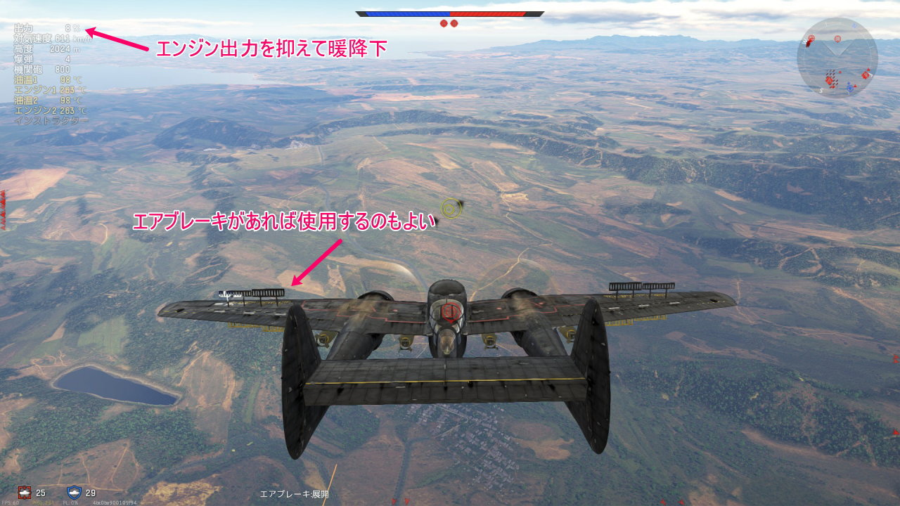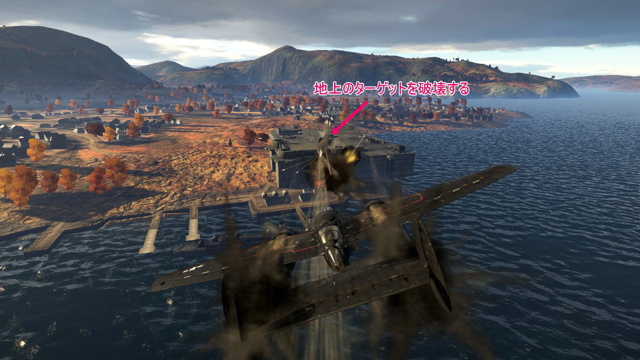 小基地への爆撃が終わったら機銃を使い地上のターゲットを破壊します。しばらくすると敵機がやってくるはずなので、銃座がついている場合は手動に切り替え敵機を撃墜していきましょう。P-61C-1には4基の12.7mm銃座が搭載しており、慣れが必要ですが戦闘機を返り討ちにすることもできます。敵機と交戦した時点で瀕死のダメージを負っているので適当に落とされて次にバトルに備えましょう。