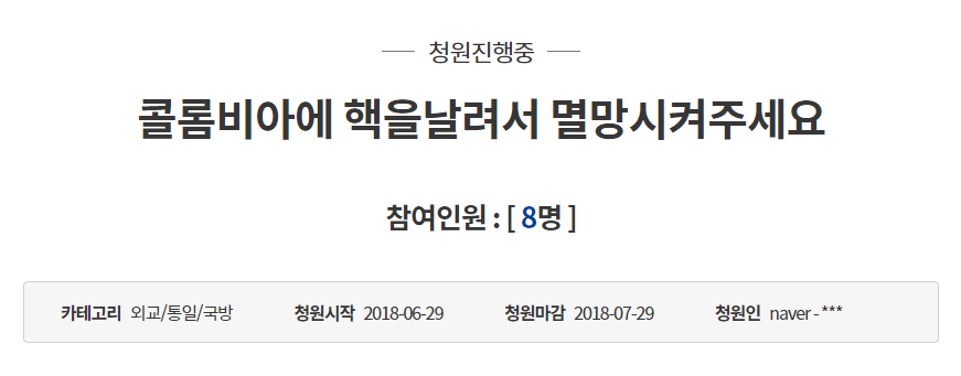 また同じグループリーグH組でセネガルとの試合に勝利し、結果的に日本が決勝リーグに進出することができた試合結果となったコロンビアチームに対しては「コロンビアに核(兵器)を飛ばして滅亡させてください」という請願が寄せられています。(韓国は核兵器を開発しておらず保有もしていない)