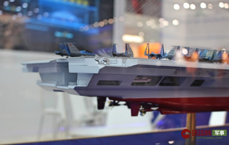 こちらが中型空母とされる模型です。記事によると基準排水量は40500トン、満載排水量は44000トンで全長は304m、幅は78m。速力は巡航速力が16ノット、最大28ノット。巡航速力での行動範囲は8000マイル(約12,874km)で作戦継続日数は60日とされています。