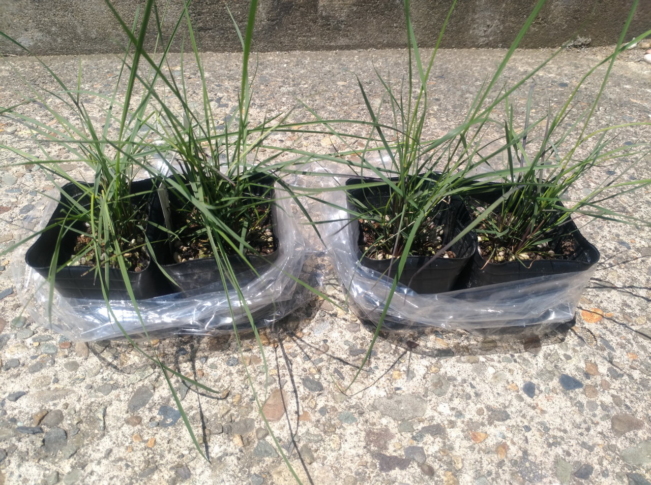 こちらが2018年5月に購入したムーレンベルギア・カピラリスの苗です。1株500円ほど。日本ではわずかにネットショッピングで売られている程度で、近所のホームセンターどころか専門の花屋でも置いてあるところはほぼ無いと思われます。この時点で高さは25~27cmです。この苗を30cm間隔で4株植えてみました。