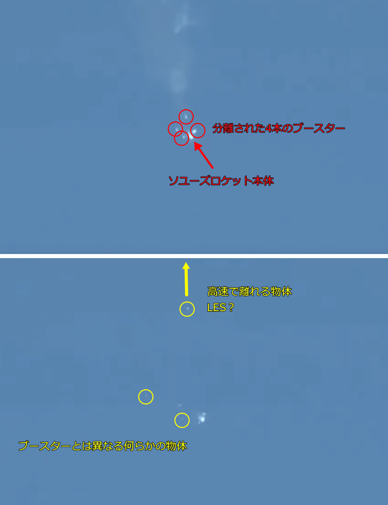 合わせて今回の打ち上げ映像では船内映像では宇宙飛行士が通常とは異なる振動する様子も映し出されていた他、地上からの映像では4本のブースターとは異なる3つの光の点も映し出されていました。ソユーズロケットが仮に直ちに分離されたとすればこの光の点がLESを構成するエスケープ・タワーやソユーズ宇宙船本体、もしくは損傷したロケットの一部の可能性も考えられます。