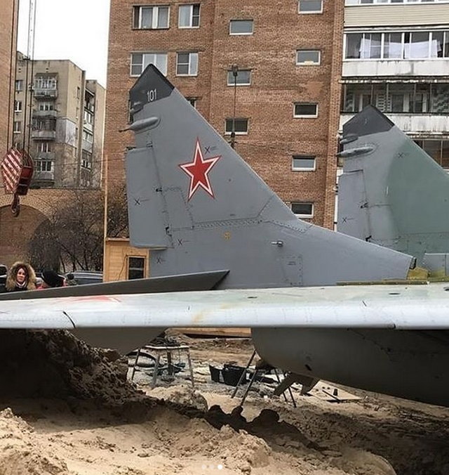 こちらがその後撮影されたと考えられるMiG-29。どうやら住宅街にある公園や広場に展示する目的で移動されていたようです。翼も取り付けられています。