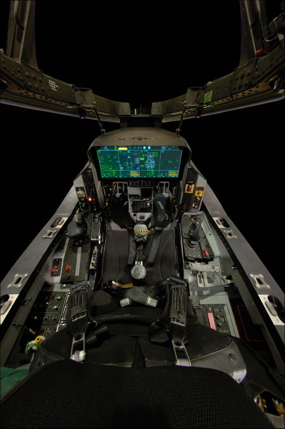▼F-22のコックピット。前方にあるのがヘッドアップディスプレイ