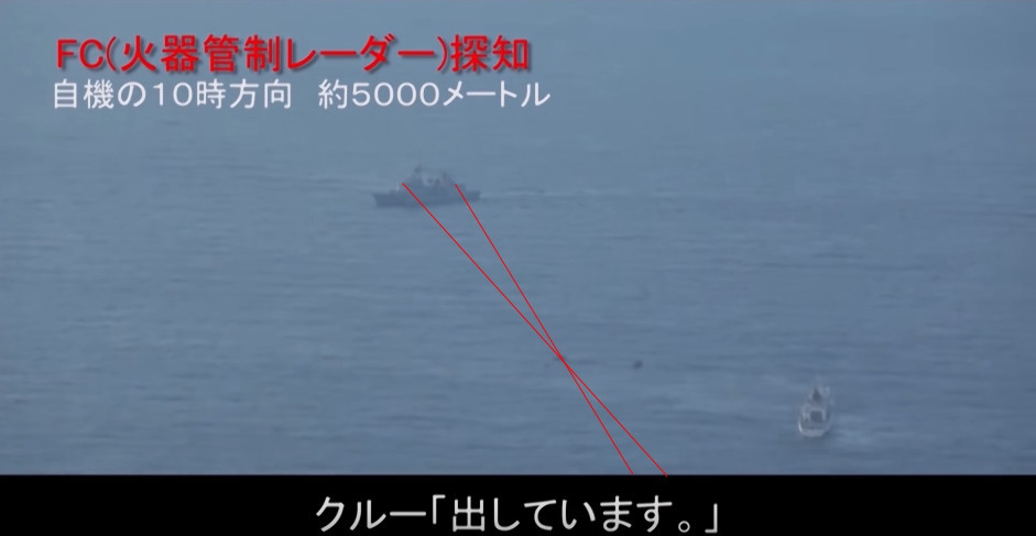 当時自衛隊機内の音声からは複数回「コンテニューホールド」という言葉がでています。6分26秒、6分38秒の2回。続いて「はい コンテニューホールド」7分21秒、「FCレーダーらしき電波探知」7分36秒、そして7分53秒にようやく「今止まりましたね」と隊員が口にしています。「コンテニューホールド」とは火器管制レーダーを照射し続けられているというもので、自衛隊機には最初の画像の6分4秒から7分53秒にかけ約2分49秒間に渡り自衛隊機は火器管制レーダーの電波を探知し続けていたということになります。