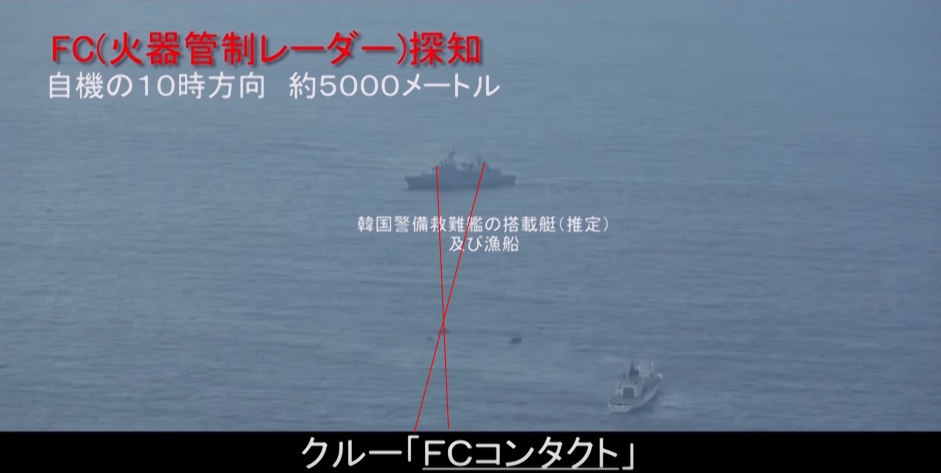 まず今回防衛省が公開された映像には韓国の艦艇から受けたタイミングで『FC(火器管制レーダー)探知』という文字による表記があります。