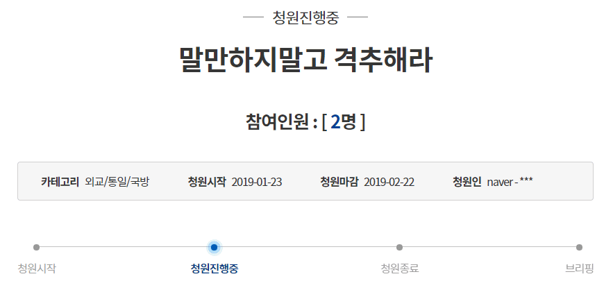 また内容が合ってるのか不明なのですが「南北(韓国と北朝鮮)が強力して、日本にミサイルを発射し海に沈めよう」という請願も寄せられています。この「南北が強力して~」という表現は他にもいくつかあり、その対象となるのは何故か日本が多い印象を受けます気がします。