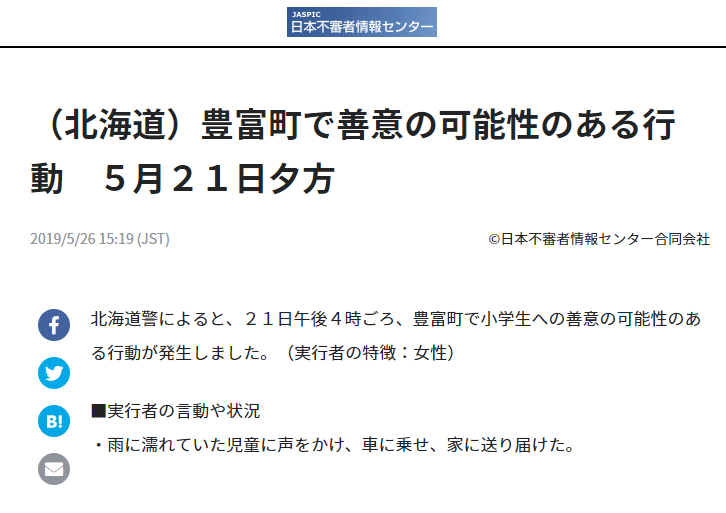 日本不審者情報センターによると先日北海道警察の情報として児童に声をかけ車で家まで送り届けたという人物がいたとして、これが不審者情報センターの掲載するという出来事がありました。一方ネット上では「善意以外なにがあるのか」というものや「男なら間違いなく不審者」「男なら事細かに特徴を書かれるだろう」などと取扱の違いに性差別があるという書き込みも多く寄せられていました。