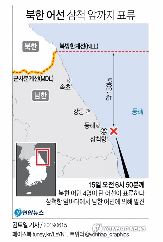 記事によると、北朝鮮の漁船は南北の境界線でるNLL(北方限界線)を超え直線距離で130~150km南下した三陟港沖合まで漂流していたといいます。当局によるとこの漁船はエンジントラブルで漂流していたとしています。