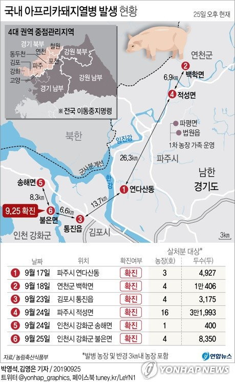 강화서 연이틀 아프리카돼지열병 비상…국내 발생 6건으로 늘어(종합) | 연합뉴스