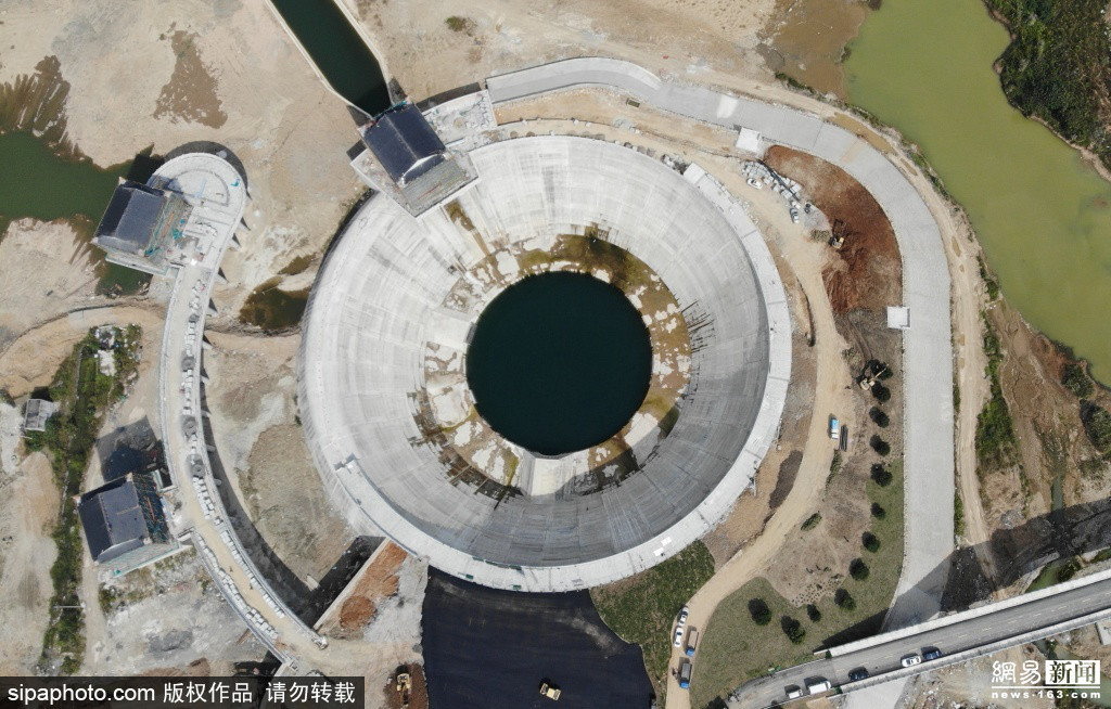 中央のくぼみには20万立法メートルの水を貯めることができ近隣の街に水を送るための巨大貯水池になっているとのこと。つまり給水プロジェクトの一環として建設されたものであり総工費は100億元相当(約1500億円)とされています。ここから伸びる給水管は直径6.7mあり総延長は113kmとのことです。