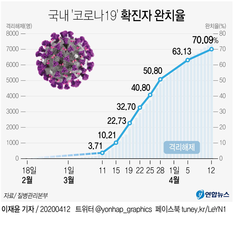 韓国メディア聯合ニュースによると、今月12日、中央防疫対策本部として午前0時時点で新型コロナウイルスに感染した人のうち完治した人は7,368人となり、累積感染者10,512人の70.09%を占めたと報じています。